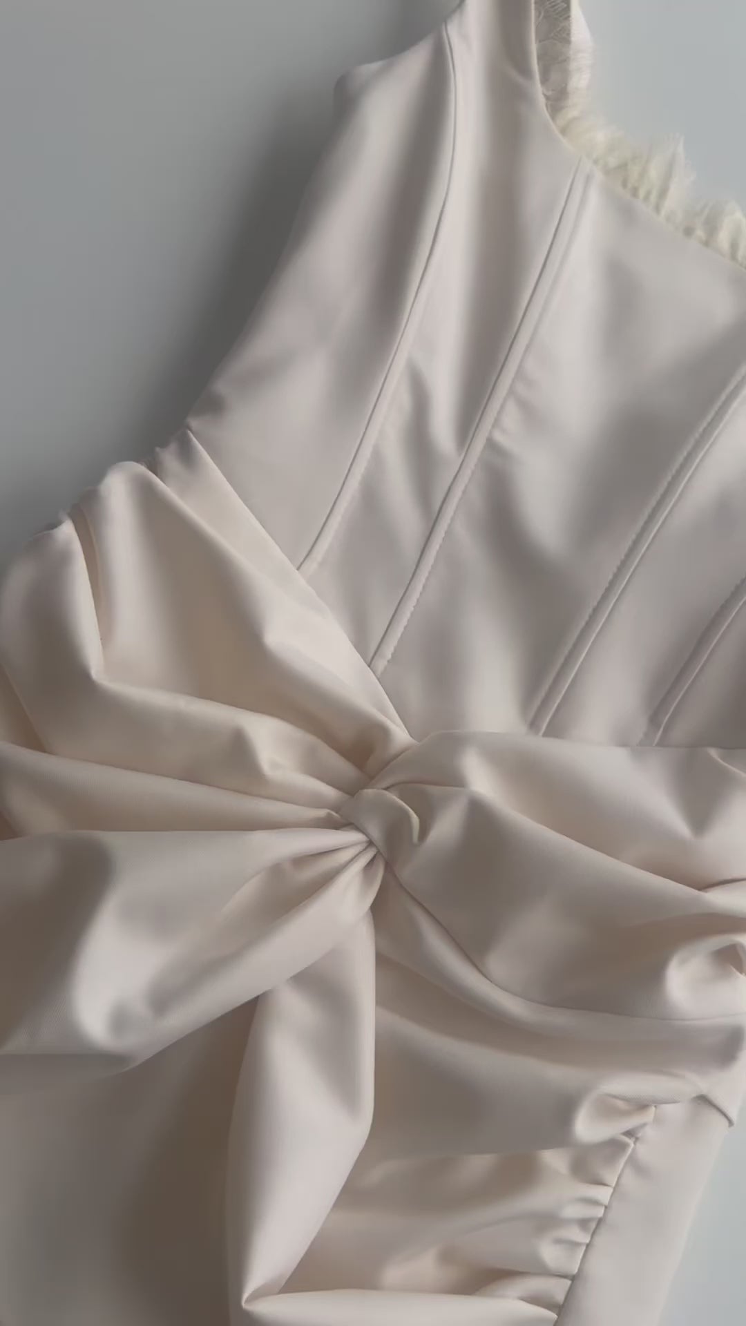 The Corset Dress With French Lace Elements in Ecru blends softness and structure in one stunning piece. The corset-style top shapes the waist and gives the dress a confident and feminine look. The neckline includes delicate French lace that adds a gentle romantic touch without feeling overdone. The skirt features gathered draping and a stylish knot detail that draws the eyes and creates a smooth hourglass shape. The lace trim peeking from the hem gives the dress a charming finish. The dress sits short and feels perfect for a party, dinner outing, or a special moment where you want to feel confident and stylish. The smooth fabric pairs well with heels, gold jewelry, or a simple clutch.