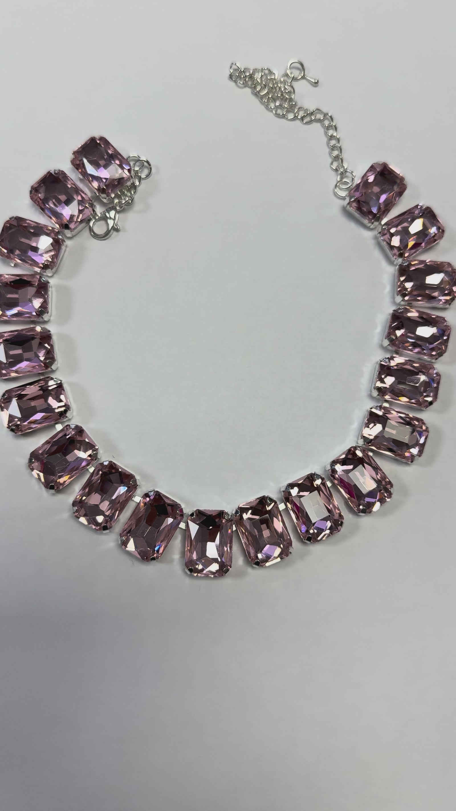 This Pink One Row Necklace features large rectangular crystal stones arranged in a clean, single-line design. Each stone has a soft pink tone with a faceted finish that reflects light beautifully from every angle. The silver-toned setting keeps the look neat and balanced, while the adjustable chain adds comfort and flexibility in fit. The bold stone size gives this necklace a strong presence, making it ideal for evening wear, parties, weddings, or special events. Despite its statement look, the design feels smooth and comfortable around the neck. Pair it with simple dresses, off-shoulder outfits, or solid colors to let the necklace stand out. If you love jewelry that feels elegant yet eye-catching, this piece brings the right mix of shine, color, and confidence to your look.